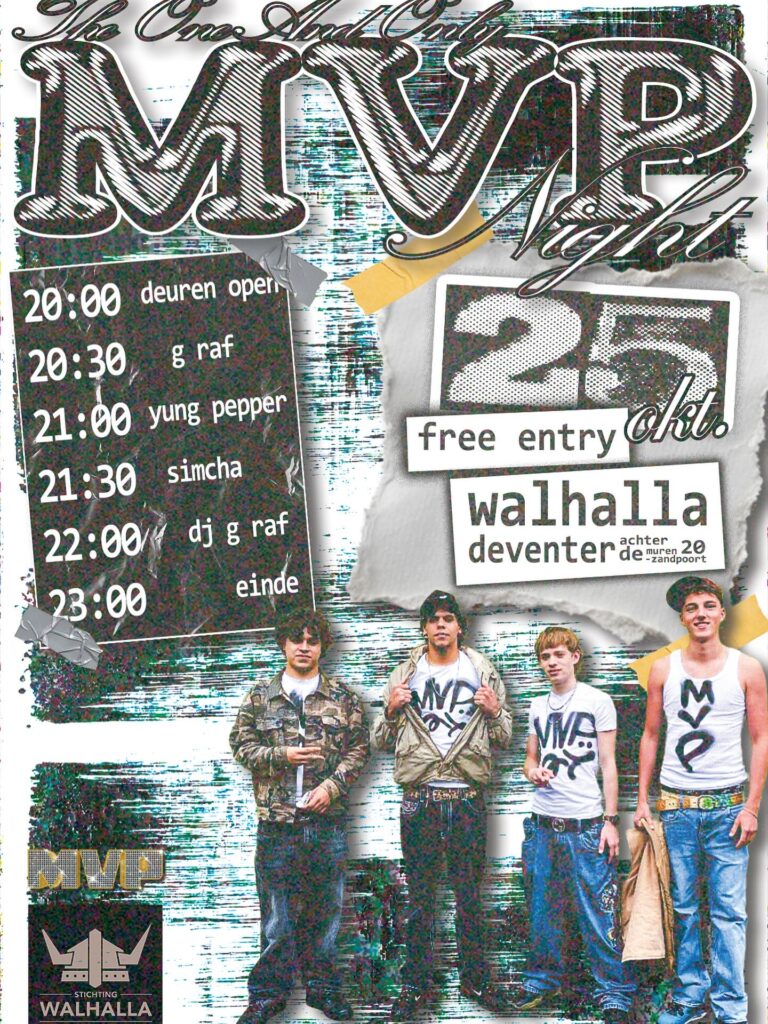 MVP Collective 25 oktober 2025 20:00 Zaterdag komt MVP Collective naar Deventer! DJ G Raf Yung Pepper Simcha GegevensDatum:25 oktober 2025Time:20:00 - 23:00Kosten:GratisEvenementencategorie: Live muziek/bands « All Events
